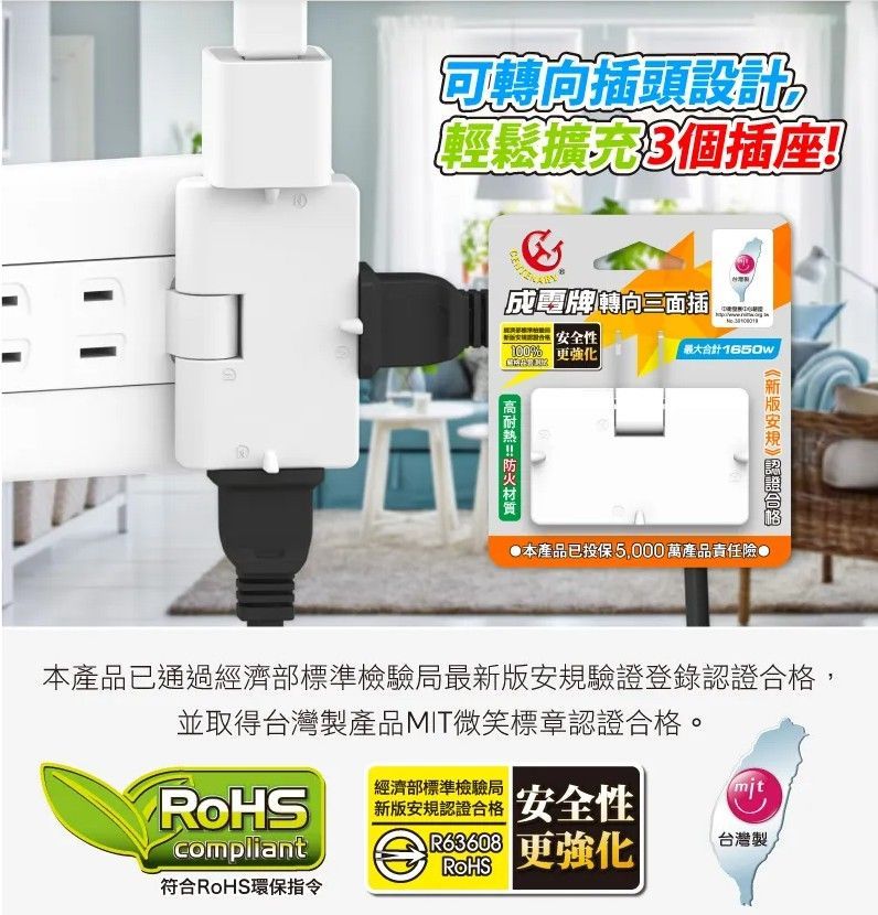 CT-0032 轉向三面插 2P小壁插,三插座,三座,可轉向插頭設計,家電用一對三電源分接器 台灣製造